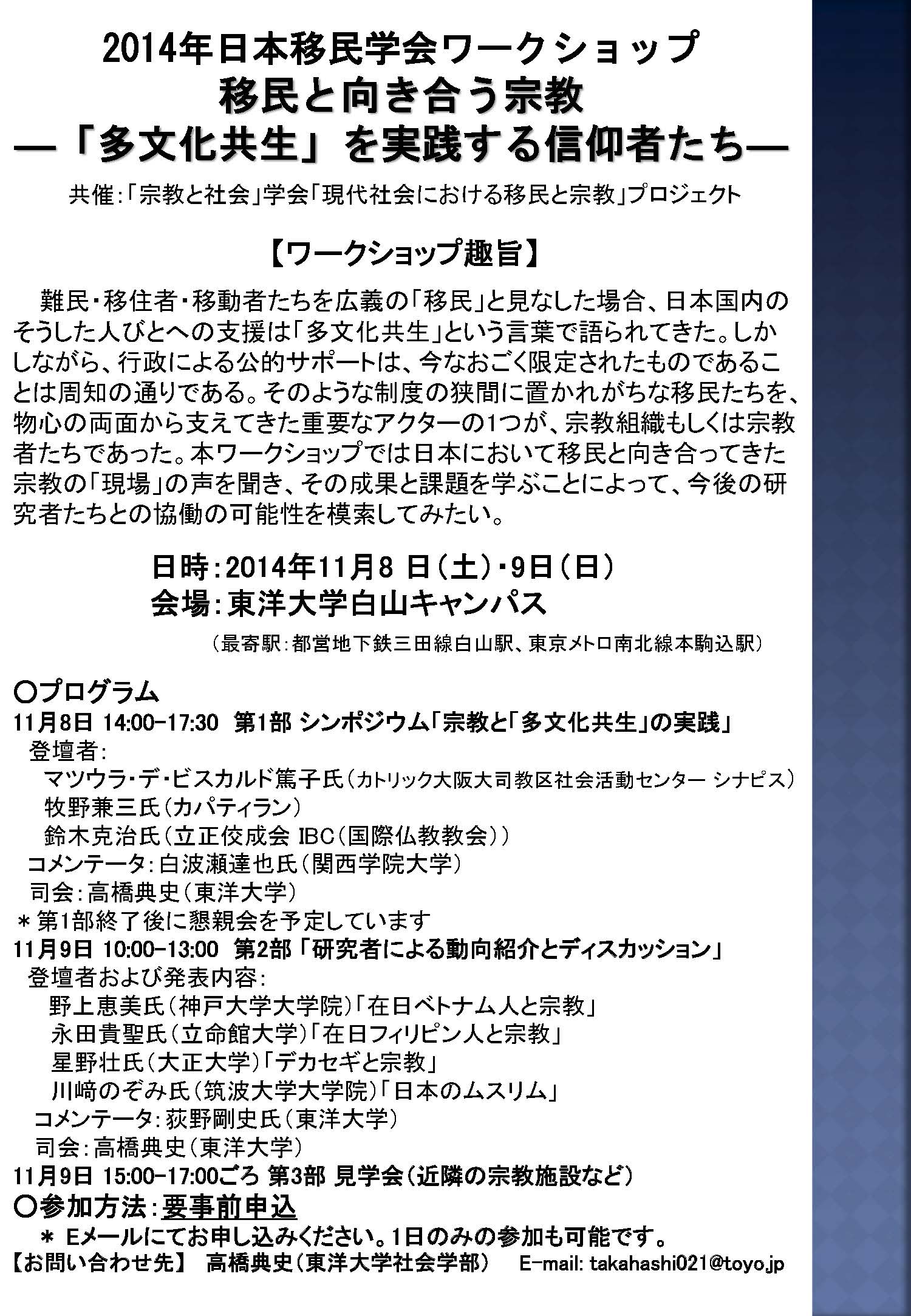 ご関心のある方々は、ぜひご参加ください。 ◯2014年日本移民学会ワークショップ 「移民と向き合う宗教―「多文化共生」を実践する信仰者たち―」 共催:「宗教と社会」学会「現代社会における移民と宗教」プロジェクト 【ワークショップ趣旨】 難民・移住者・移動者たちを広義の「移民」と見なした場合、日本国内のそうした人びとへの支援は「多文化共生」という言葉で語られてきた。しかしながら、行政による公的サポートは、今なおごく限定されたものであることは周知の通りである。そのような制度の狭間に置かれがちな移民たちを、物心の両面から支えてきた重要なアクターの1つが、宗教組織もしくは宗教者たちであった。本ワークショップでは日本において移民と向き合ってきた宗教の「現場」の声を聞き、その成果と課題を学ぶことによって、今後の研究者たちとの協働の可能性を模索してみたい。 日時:2014年11月8 日(土)・9日(日) 会場:東洋大学白山キャンパス1号館6階1601教室 (最寄駅:都営地下鉄三田線白山駅、東京メトロ南北線本駒込駅) http://www.toyo.ac.jp/site/access/access-hakusan.html http://www.toyo.ac.jp/site/campus/campus-hakusan.html#hakusan1 ○プログラム 11月8日 14:00-17:30 第1部 シンポジウム「宗教と「多文化共生」の実践」 登壇者: マツウラ・デ・ビスカルド篤子氏(カトリック大阪大司教区社会活動センター シナピス) 牧野兼三氏(カパティラン) 鈴木克治氏(立正佼成会 IBC(国際仏教教会)) コメンテータ:白波瀬達也氏(関西学院大学) 司会:高橋典史(東洋大学) *第1部終了後に懇親会を予定しています 11月9日 10:00-13:00 第2部 「研究者による動向紹介とディスカッション」 登壇者および発表内容: 野上恵美氏(神戸大学大学院)「在日ベトナム人と宗教」 永田貴聖氏(立命館大学)「在日フィリピン人と宗教」 星野壮氏(大正大学)「デカセギと宗教」 川﨑のぞみ氏(筑波大学大学院)「日本のムスリム」 コメンテータ:荻野剛史氏(東洋大学) 司会:高橋典史(東洋大学) 11月9日 15:00-17:00ごろ 第3部 見学会(近隣の宗教施設など) ○参加方法:【要事前申込】下記の事項を書き添えてEメールにてお申し込み下さい ・記入事項 (1)お名前、ご所属、ご連絡先(メールアドレス等) (2)参加を希望するプログラム 11月8日(土):第1部(参加/不参加) 懇親会(参加/不参加) 懇親会費は4,000円程度を予定しています 11月9日(日):第2部(参加/不参加) 見学会(参加/不参加) ・申込先メールアドレス: takahashi021(a)toyo.jp (a)を@に変更してメールしてください *見学会(同キャンパス周辺を予定)の詳細につきましては、お申し込みされた方々に別途ご連絡いたします。 【お問い合わせ先】 高橋典史(東洋大学社会学部) E-mail: takahashi021(a)toyo.jp →(a)を@に変更してメールしてください |
