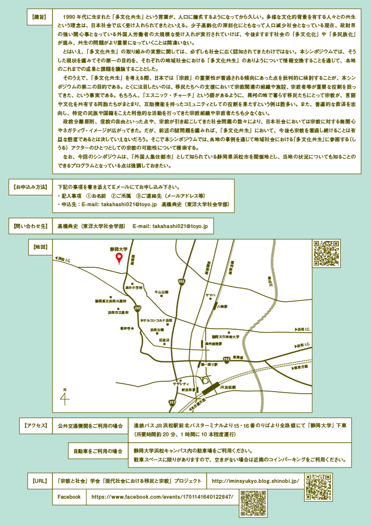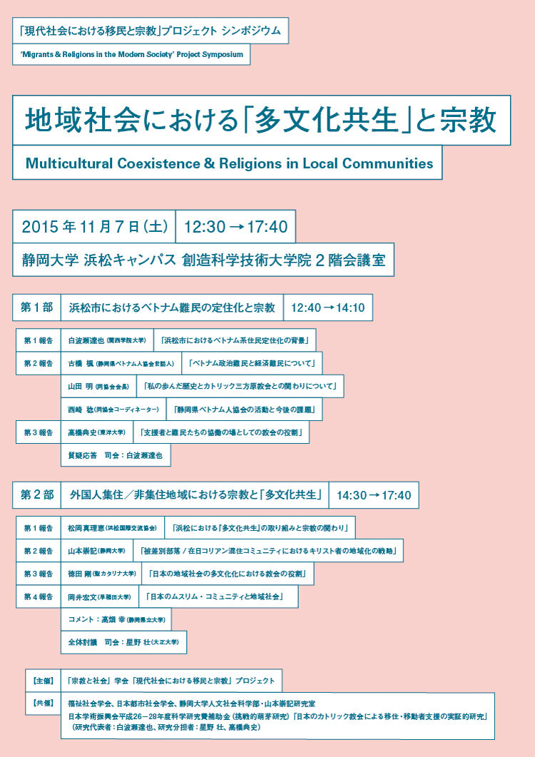 ご関心のある方々は、ぜひご参加ください! ↓ 「宗教と社会」学会「現代社会における移民と宗教」プロジェクト 2015年度シンポジウム「地域社会における「多文化共生」と宗教」 【趣旨】 1990年代に生まれた「多文化共生」という言葉が、人口に膾炙するようになってから久しい。多様な文化的背景を有する人々との共生という理念は、日本社会で広く受け入れられてきたといえる。少子高齢化の深刻化にともなって人口減少社会となっている現在、政財界の強い関心事となっている外国人労働者の大規模な受け入れが実行されていけば、今後ますます社会の「多文化化」や「多民族化」が進み、共生の問題がより重要になっていくことは間違いない。 とはいえ、「多文化共生」の取り組みの実態に関しては、必ずしも社会に広く認知されてきたわけではない。本シンポジウムでは、そうした現状を鑑みてその第一の目的を、それぞれの地域社会における「多文化共生」のありようについて情報交換することを通じて、各地のこれまでの成果と課題を議論することとした。 そのうえで、「多文化共生」を考える際、日本では「宗教」の重要性が看過される傾向にあった点を批判的に検討することが、本シンポジウムの第二の目的である。本シンポジウムでとくに注目したいのは、移民たちへの支援において宗教関連の組織や施設、宗教者等が重要な役割を担ってきた、という事実である。もちろん、「エスニック・チャーチ」という語があるように、異邦の地で暮らす移民たちにとって宗教が、言語や文化を共有する同胞たちがまとまり、互助機能を持ったコミュニティとしての役割を果たすという例は数多い。また、人類全般についての平等観を有して普遍的な救済を志向し、特定の民族や国籍をこえた利他的な活動を行ってきた宗教や宗教者たちも少なくない。 政教分離原則、信教の自由といった点や、宗教が引き起こしてきた社会問題の数々により、日本社会においては宗教に対するネガティヴ・イメージや無関心が広がってきた。だが、前述の諸問題を鑑みれば、「多文化共生」において、今後も宗教を看過し続けることは有益な態度であるとは決していえないだろう。そこで本シンポジウムでは、各地の事例を通じて地域社会における「多文化共生」に参画する(しうる)アクターの1つとしての宗教の可能性について模索する。 なお、今回のシンポジウムは、「外国人集住都市」として知られている静岡県浜松市を開催地とし、当地の状況についても知ることのできるプログラムとなっている点は強調しておきたい。 ◯シンポジウムの概要 開催日:2015年11月7日(土) 会場:静岡大学浜松キャンパス 創造科学技術大学院2階会議室 主催:「宗教と社会」学会「現代社会における移民と宗教」プロジェクト 共催:福祉社会学会、日本都市社会学会、静岡大学人文社会科学部・山本崇記研究室、日本学術振興会平成26-28年度科学研究費補助金(挑戦的萌芽研究)「日本のカトリック教会による移住・移動者支援の実証的研究」(研究代表者:白波瀬達也、研究分担者:星野 壮、高橋典史) 趣旨説明 12:30-12:40 高橋典史(東洋大学) 第1部「浜松市におけるベトナム難民の定住化と宗教」12:40-14:10 第1報告 白波瀬達也(関西学院大学) 「浜松市におけるベトナム系住民定住化の背景」 第2報告 古橋楓、山田明(トランバンミン)、西崎稔(以上、静岡県ベトナム人協会) (1)古橋楓(世話人)「ベトナム政治難民と経済難民について」 (2)山田明(会長)「私の歩んだ歴史と浜松三方原教会とのかかわりについて」 (3)西崎稔(コーディネーター)「静岡県ベトナム人協会の活動と今後の課題」 第3報告 高橋典史(東洋大学) 「支援者と難民たちの協働の場としての教会の役割」 質疑応答 13:50-14:10 司会:白波瀬達也(関西学院大学) (休憩)14:10-14:30 第2部「外国人集住/非集住地域における宗教と「多文化共生」」14:30-17:40 第1報告 松岡真理恵(浜松国際交流協会) 「浜松における「多文化共生」の取組みと宗教の関り」 第2報告 山本崇記(静岡大学) 「被差別部落/在日コリアン混住コミュニティにおけるキリスト者の地域化の戦略」 第3報告 徳田剛(聖カタリナ大学) 「日本の地域社会の多文化化における教会の役割」 第4報告 岡井宏文(早稲田大学) 「日本のムスリム・コミュニティと地域社会」 (休憩)16:10-16:20 コメント 高畑幸(静岡県立大学) 全体討議 司会 星野壮(大正大学) 懇親会18:30- (浜松駅近辺) ◯参加方法 【要事前申込】下記の事項を書き添えてEメールにてお申し込み下さい ・記入事項 (1)お名前、ご所属、ご連絡先(メールアドレス等) ・申込先E-mail: takahashi021(a)toyo.jp →(a)を@に変更してメールしてください ◯お問い合わせ先 高橋典史(東洋大学社会学部) E-mail: takahashi021(a)toyo.jp →(a)を@に変更してメールしてください ◯下記フライヤー(チラシ)は、こちらよりPDFファイル版をダウンロードできます。 |