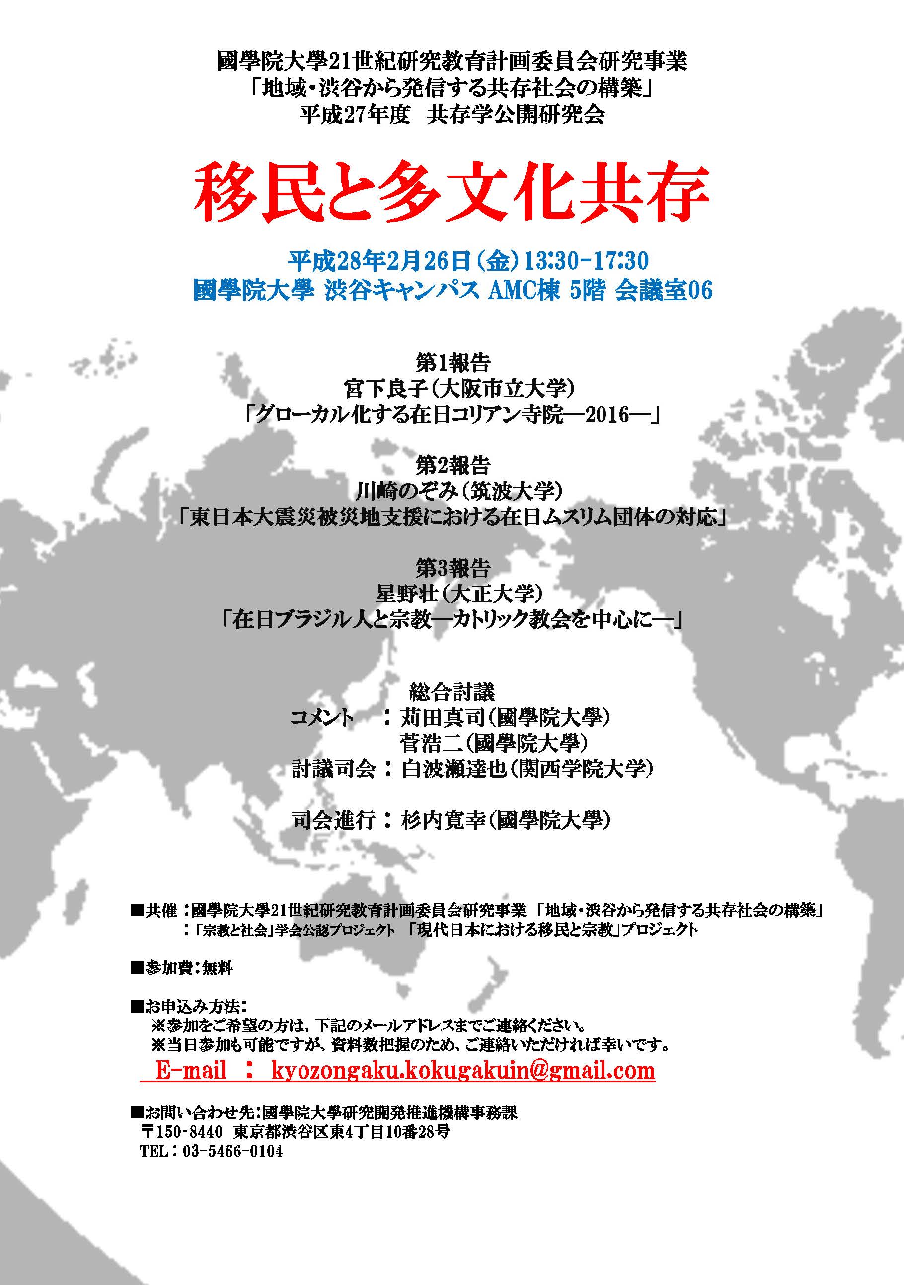 ご関心のある方々は、ぜひ参加ください! ----------------------------------------------------------------------------- 國學院大學21世紀研究教育計画委員会 研究事業 「地域・渋谷から発信する共存社会の構築」 第1回 共存学公開研究会「移民と多文化共存」 日時:2016年2月26日(金)13:30-17:30 場所:國學院大學 渋谷キャンパス AMC棟 5階 会議室06 プログラム: 第1報告 宮下良子(大阪市立大学) 「グローカル化する在日コリアン寺院―2016―」 第2報告 川崎のぞみ(筑波大学) 「東日本大震災被災地支援における在日ムスリム団体の対応」 第3報告 星野壮(大正大学) 「在日ブラジル人と宗教―カトリック教会を中心に―」 総合討議 コメント:苅田真司(國學院大學) 菅浩二(國學院大學) 討議司会:白波瀬達也(関西学院大学) 司会進行:杉内寛幸(國學院大學) ■共催:國學院大學研究開発推進機構 研究開発推進センター 國學院大學21世紀研究教育計画委員会研究事業 「地域・渋谷から発信する共存社会の構築」 共存学プロジェクト 「宗教と社会」学会公認プロジェクト「現代日本における移民と宗教」プロジェクト ■参加費:無料 ■お申込み方法: ※参加をご希望の方は、下記のメールアドレスまでご連絡ください。 ※当日参加も可能ですが、資料数把握のため、ご連絡いただければ幸いです。 E-mail : kyozongaku.kokugakuin(a)gmail.com ←(a)を@に変えてご連絡ください。 ■お問い合わせ先:國學院大學研究開発推進機構事務課 〒150‐8440 東京都渋谷区東4丁目10番28号 TEL : 03-5466-0162 *ポスターのPDFファイルは、こちらからダウンロードしてください。 |